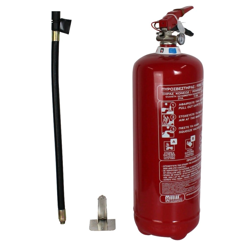 ABC powder fire extinguisher, 40%, 6 kg is used to extinguish and prevent fires that may be caused by the burning of A-paper, textiles, wood and plastic. B- Combustible materials and C- fires caused by electrical equipment. Extinguishing is carried out by throwing the powder around the fire in order to prevent and eliminate the fire. The cylinder is made of special steel according to European Standards.