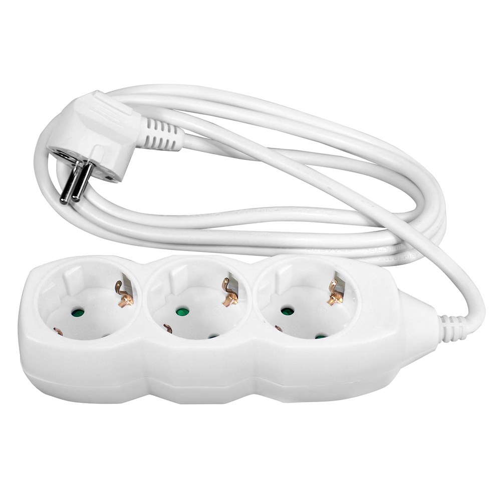 power supply extension cords (schuko type) • 3 sockets • ~230 V/10 A max • length 1,5 m • packaging: 1 pc., plastic bag • carton quantity: 1/18/36 •
