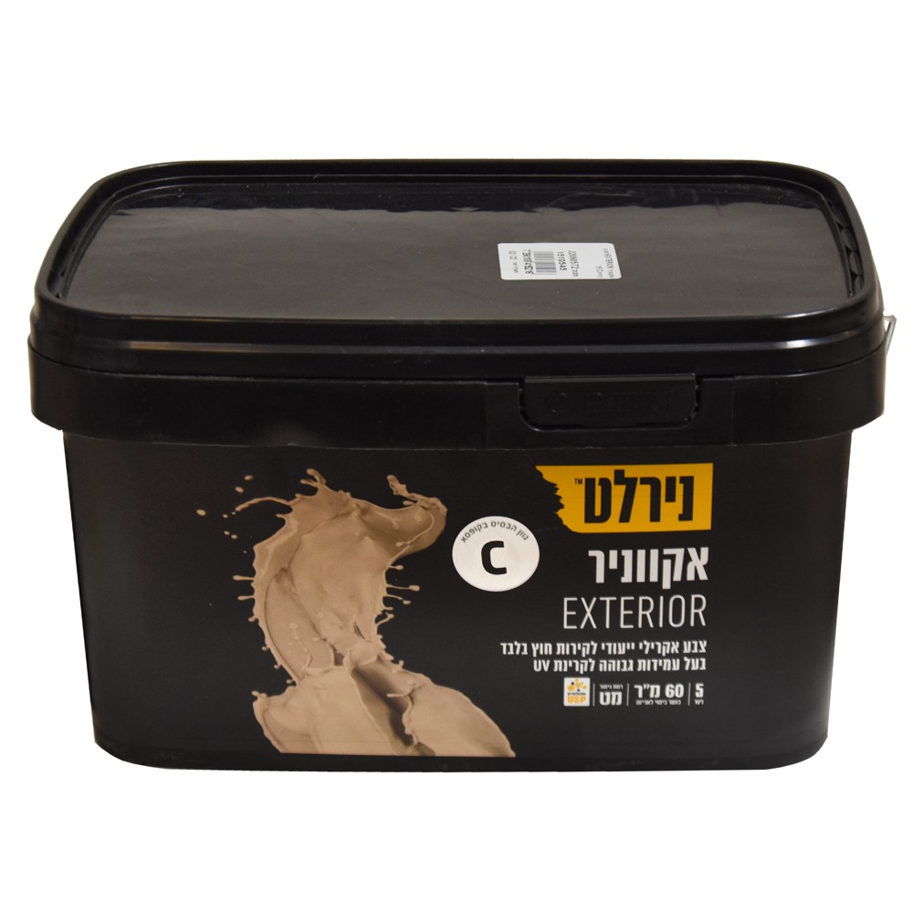 Aquanir acrylic paint, 5 Lt, white. Flexible acrylic paint with exceptional coverage, usable outdoors. After painting, a soft velvet layer is obtained, which gives the wall of the house a pleasant, calm and elegant appearance .Durable over time and preserves the appearance.Nirocryl carries the Israel 1945 standard mark.Typical use: for exterior wall painting.Preparation of the surface: clean the surface well from impurities such as: lime, dust, layers of previous paint, grease, etc. , before you start painting. Make sure the previous paint is well adhered to the wall. Remove the wall chips well with a trowel and sandpaper. Cleaning: tools and hands should be cleaned with soap and water immediately after use. Characteristics of the coating of painting: shade of color: white plus 1500 shades from nirlat's nice catalog Gloss level: matte Material data: acrylic mixture based on water and mineral substances Dissolving: with water up to 20% for the first layer. 10% for the second layer. Coverage: 16 m2 per liter in two layers. Viscosity: 98KU ± 10%. The coverage ability is calculated according to the measurement of the work of an experienced and skilled worker, with a different degree of acquisition and may vary depending on the working method, surface and climatic conditions. Restrictions: do not apply the paint when the temperature is below 7°C or when rain is forecast. Drying time. For repainting: 2 hours (under normal weather conditions). To touch it: 1 hour. Complete drying: 24 hours.