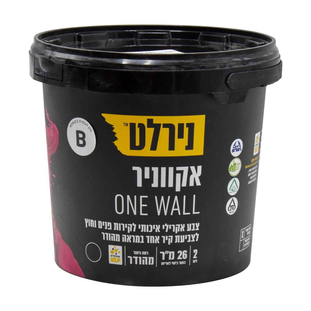 One Wall Acrylic Paint, 2 Lt, Base B. Elastic acrylic paint with exceptional coverage, usable inside and out. After painting, a soft velvet layer is obtained, which gives the house wall a pleasant, calm and elegant look. Stable over time and preserves appearance. Nirocryl bears the standard mark Israel 1945. Typical use: for interior and exterior wall painting. Surface preparation: thoroughly clean the surface from impurities such as: lime, dust, previous coatings, grease, etc., before you start painting. Make sure the previous painting is well glued to the wall. Remove the wall coverings well with a trowel and sandpaper. Cleaning: tools and hands should be cleaned with soap and water immediately after use. Coating coat characteristics: color shade: white plus 1500 shades from the nice nirlat catalog. Gloss level: mat. Material data: water-based acrylic mixture and mineral substances. Digestion: with water up to 20% for the first layer. 10% for the second layer. Coverage capacity: 16 m2 per liter in two layers. Viscosity: 98KU ± 10%. Coverage capacity is calculated according to the measurement of the work of an experienced and skilled worker, with varying degrees of acquisition and may vary depending on the working method, surface and climatic conditions. Limitations: do not apply the paint when the temperature is below 7 ° C or when rain is forecast. Drying time. For repainting: 2 hours (in normal weather conditions). To touch: 1 hour. Complete drying: 24 hours.