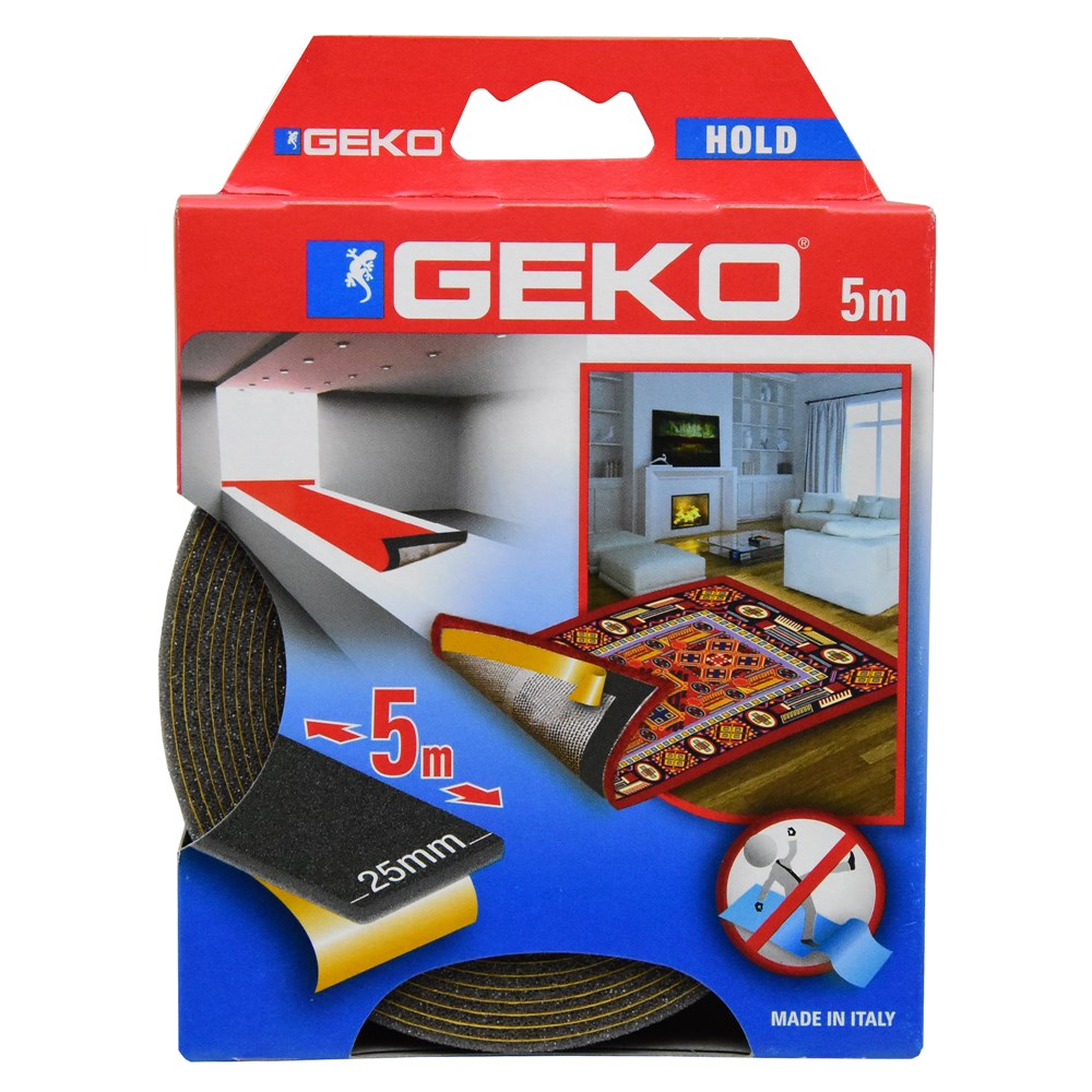 Adhesive antislip tape for carpets, Geko, Hold, 25 mm x 5 m. Can be used on many different surfaces, wood, tiles.Enjoy your carpets the way you should with these carpet grippers. Now every carpet is secured on the floor. Now everyone feels safe at home. Create a safe and protected place for your kids to play around