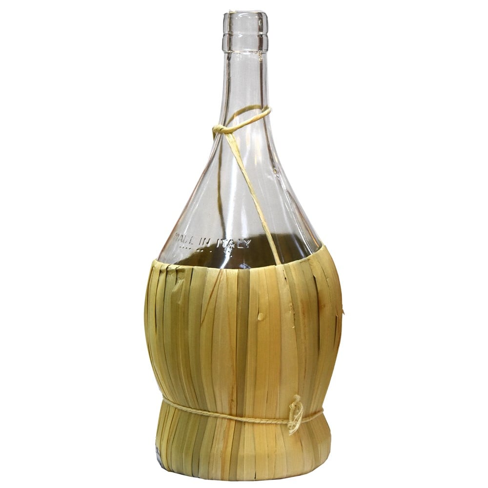 Alcoholic beverage bottle, made of high quality transparent glass material, with hygienic properties, with a capacity of 1.5 l. The bottle is equipped with an outer coating of straw material, which protects the bottle from shocks, plays a decorative role and protects beverages stored in it from exposure to light, preventing the fastening of the oxidation process and loss of beverage quality. This product is suitable for professional and non-professional use.