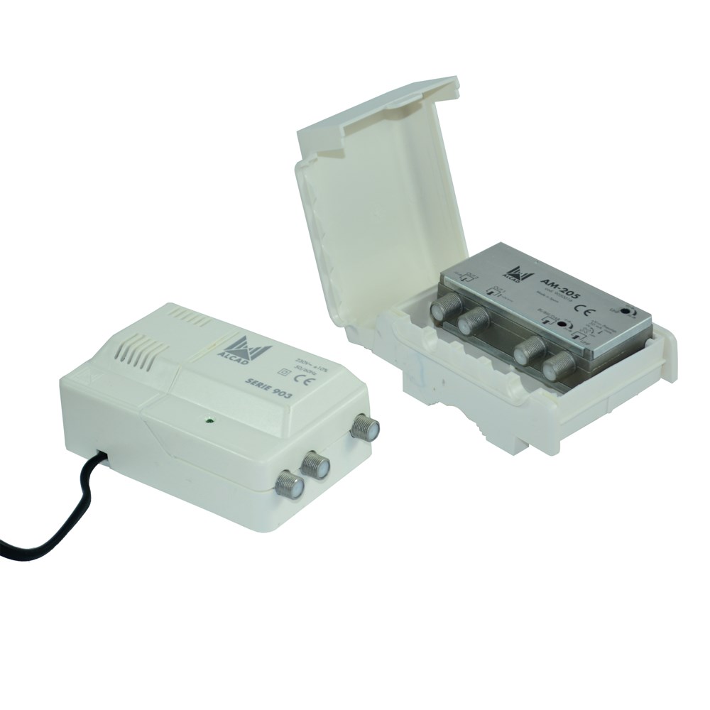 Multiple input broadband amplifiers. Made in a compact housing, they are capable of providing signal to a large number of outlets. They have two identical outputs that allows an increase to the number of outlets. The built-in power supply is capable of au