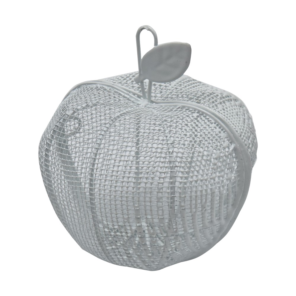 Apple-shaped confetti holder, made of metal material, with dimensions of 9 cm, in white color. It is used to place chocolates, candies or other small sweets, on the occasion of various holidays, and serves as a welcome gift for guests.