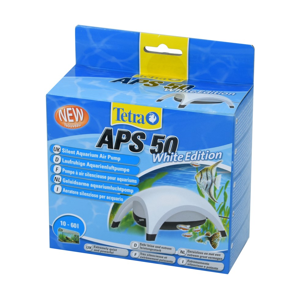 This air pump is for use with all aquaria from 10 to 60 litres in size. With the external flow control valve included, the TetraTec APS 50 can be easily adjusted to provide the right air flow for all purposes . Innovative design reduces noise while producing high flow. The external flow control valve is included. Exeptional quality and reliability giving a 3 year guarantee.Technical data: high flow due to powerful long-lasting diaphragm, very quiet due to noise supression chambers that absorb sound waves, very quiet operation due to innovative construction of pump, pump output: max: 50 l/h, power consumption: 2 W 230 V/50 Hz, for aquaria from 10 to 60 l, number of outputs: 1