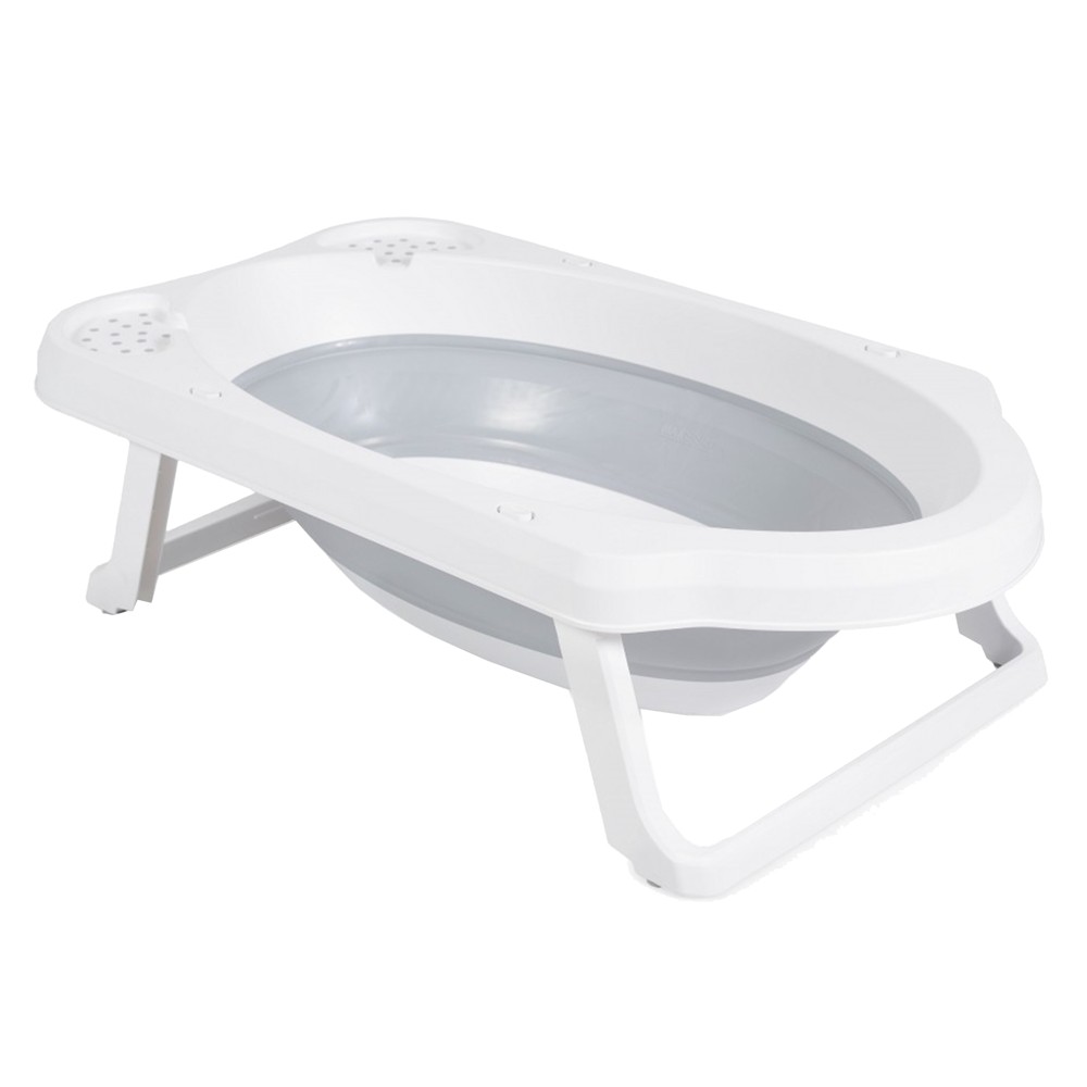 Bathtub for children, made of plastic and silicone material, which gives you the possibility to fold and be more practical and in this way does not take up much space. It has a size of 84x23x48 cm, and is white and gray in color. There are also two support legs that open and close, two convenient spaces for placing shampoos, as well as a stopper that drains the water. There are also silicone dots on the inside which ensure that the child does not slip during the shower. Suitable for children from 0-24 months.