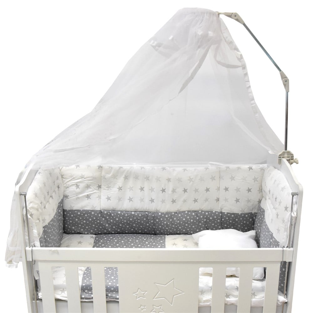 Baby bed bumpers, made of soft cotton material, with antibacterial and antiallergic properties, which include bedside panel bumpers with dimensions 60/120/60x46 cm and 120x46 cm, a bed cover with dimensions 130x80 cm, a tulle curtain and a 90 cm metal rod for placing the curtain on the bed panels. The side bumpers are used to protect children during sleep and during play. The tulle curtain is used to decorate the bed and also protects children from mosquitoes.