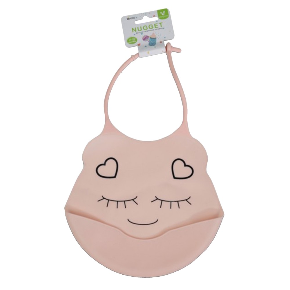 Cangaroo silicone nipple in pink. The gill has a pocket and is made of soft silicone. Protects baby's clothes from stains. Adjustable clip. Also, this gill has painted and some features of a girl accompanied by hearts.