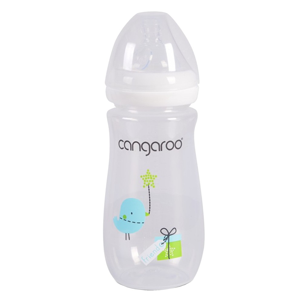 Baby bottle, made of plastic material, without BPA synthetic compounds, with a feeding head made of soft silicone and a protective plastic cap, in transparent color. The feeding head has advanced anti-colic properties that minimize the passage of air during feeding, preventing colic in babies. The bottle has an ergonomic design, which allows it to be easily held and makes it practical to use. This product is suitable for babies over 3 months.