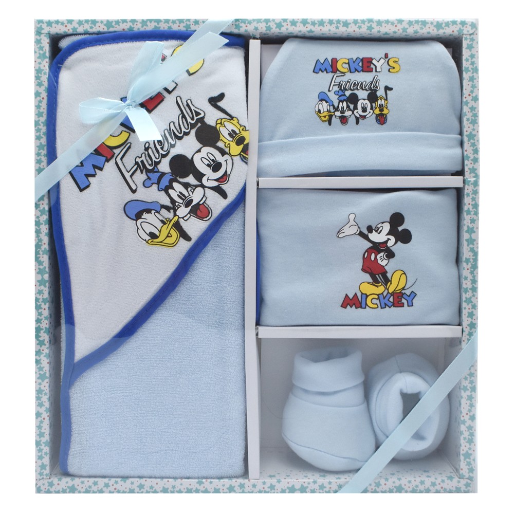 Mickey Mouse 4-piece baby set is made of 100% cotton material. Inside the package there is a shower towel, a gill, a hood and a pair of socks which are used in the first days of birth. This set is ideal for gifts.