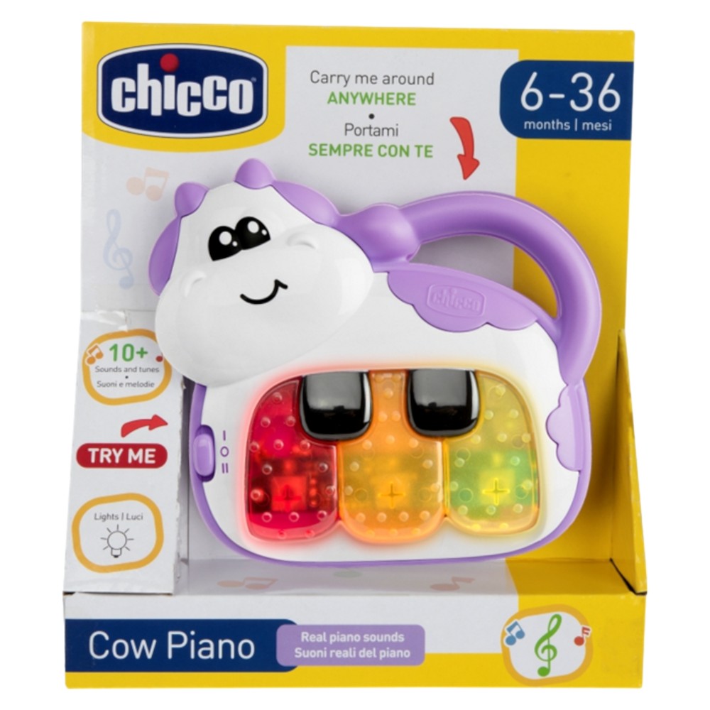 Chicco Baby Senses is a line of colorful, attention-grabbing toys that stimulate the development of your baby's senses through exercises that improve memory and concentration. Baby Senses Musical Fudge is a perfect toy that will allow your child to learn about the world of music in an interesting and fun way. The adorable cow will allow your baby to play his first notes. The fudge has three electronic keys with lights. Turn on the toy by selecting the volume level and press one of the buttons to learn the first three notes: DO, RE, MI and activate fun music, real piano sounds and lighting effects. The shape and small size of the toy make it perfect for small children's hands. The musical fudge helps develop motor skills, and thanks to the handle it is easy to carry.