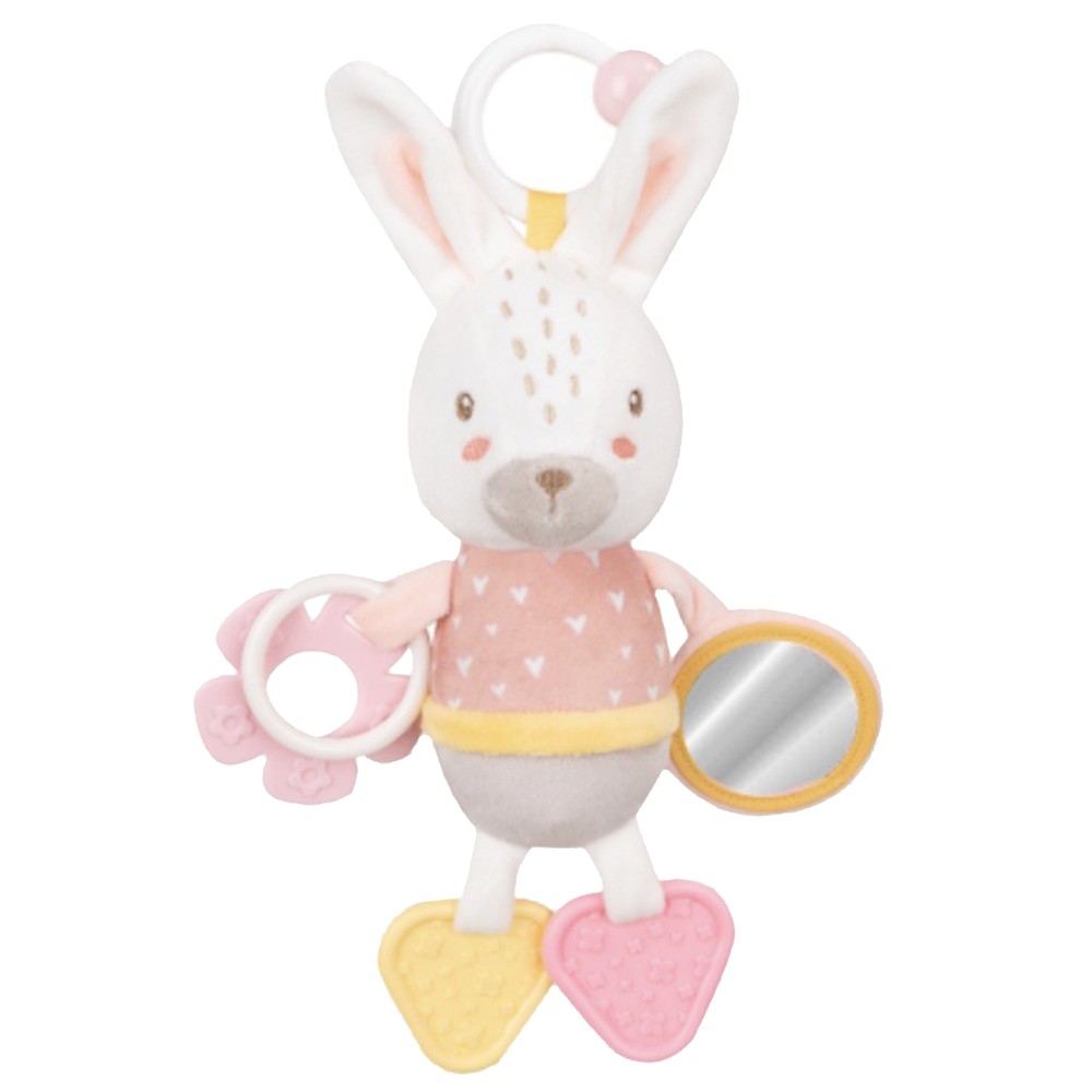 The toy is made of plush material, which is soft and safe for young children to play and explore. With a length of about 27 cm, it is easy for children to hold and have fun with this toy. The rabbit has different colors and visual elements that stimulate children's vision and interest.