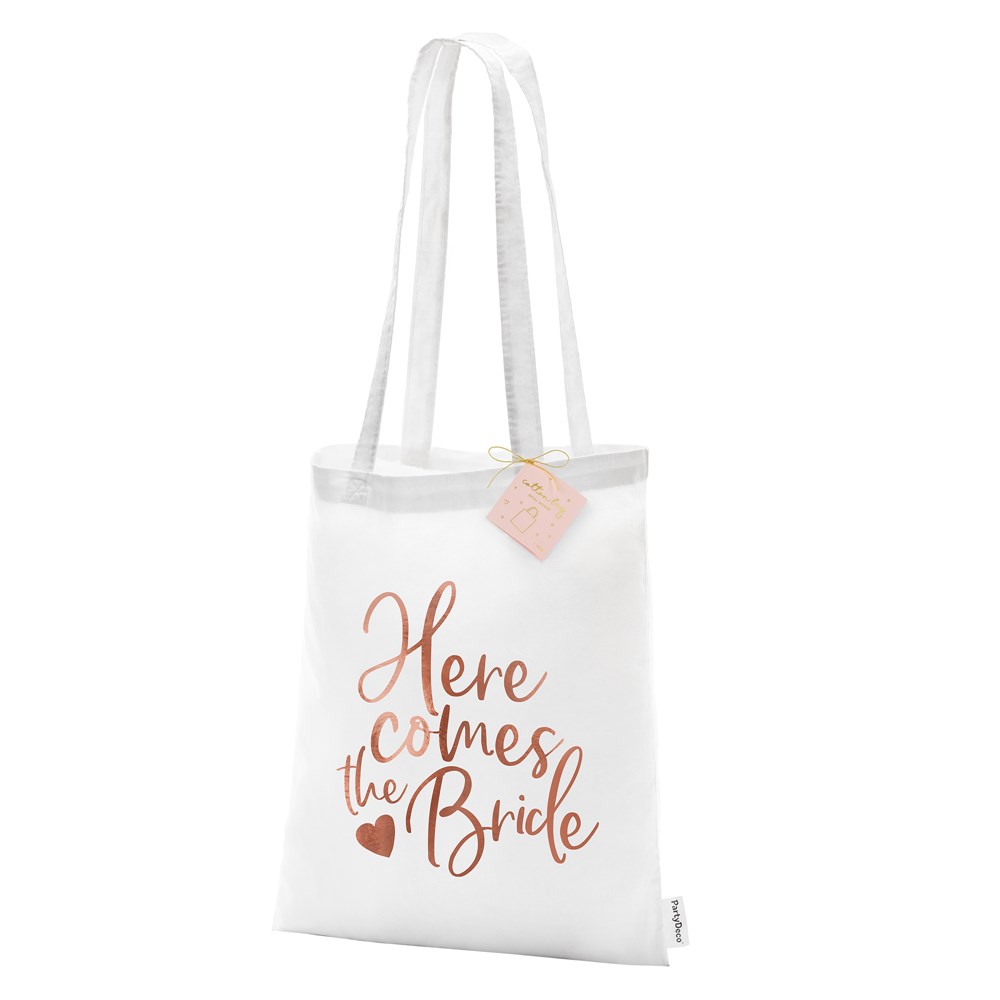 Barchelette party bag, made of white cotton with the inscription Here comes thë bride with golden rose writing color. Approximate size 39 x 42 cm.
