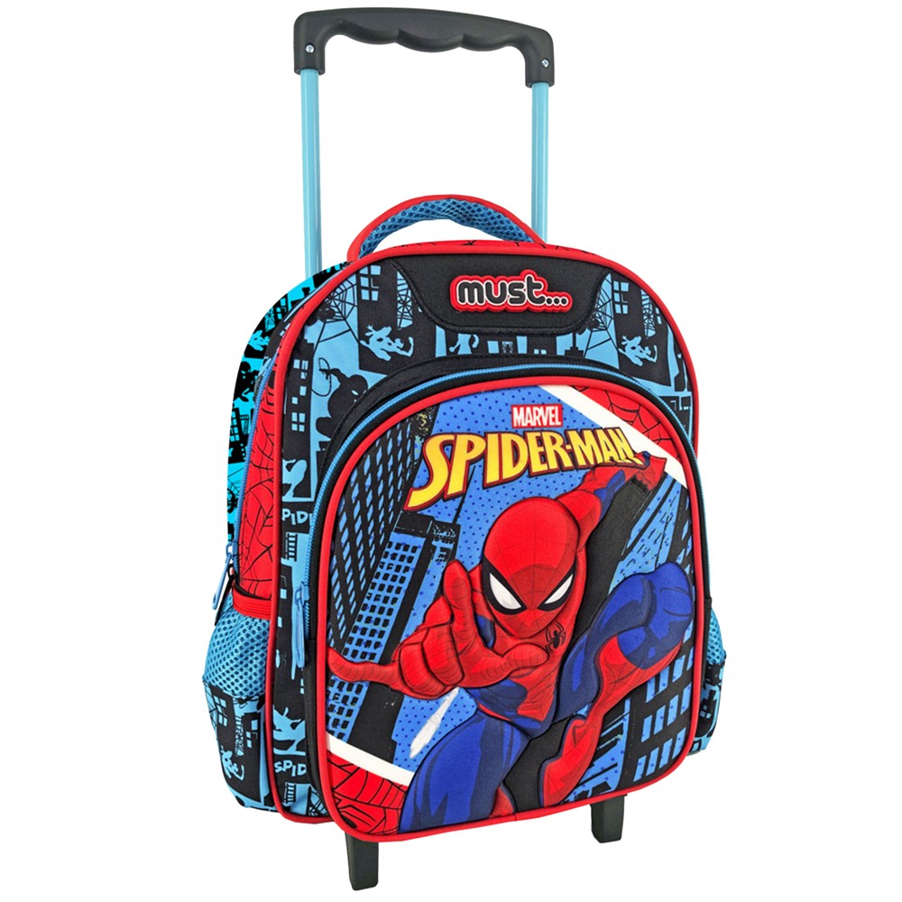 Bag for preschoolers, made of plastic and polyester material, with dimensions of 31x27x10 cm, with Spiderman design, in blue and red colors. The bag is equipped with wheels and a handle, which make it easy for small children to carry.