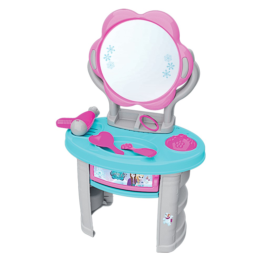 Beauty accessories toy set for children, which contains a mirror, a hair dryer, a hand mirror, a comb, a makeup box, a drawer and 2 shelves, made of plastic material, in pink and blue color. This toy helps develop motor skills, learning skills and thinking skills, and stimulates the development of imagination in children. The constituent material and the paint have no toxic or harmful composition for children and the product is certified for children's safety. This product is suitable for use by children over 3 years old.