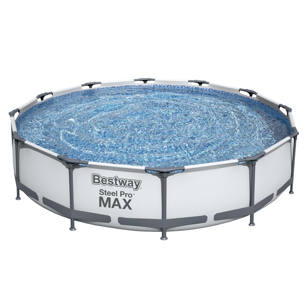 Removable above-ground Steel Pro Max™ pool, in a round shape, made of synthetic DuraPlus™ material, composed by a triplate polyvinyl chloride (PVC) layer, covered with 2 layers of vinyl PVC and reinforced with a nylon and polyester mesh layer between the inner layers, which makes it more durable and puncture-resistant. The tubular support structure with Framelink System™ technology is equipped with a constituent material made of galvanized steel, which has anti-rust properties and it is resistant against the corrosion caused as a result of the chemical and electro-chemical agents' action on the metallic surface. The pool has dimensions of Ø427xH107 cm and a water capacity of 13030 liters. It can be assembled and dismantled easily in only 20 minutes. The set also contains: