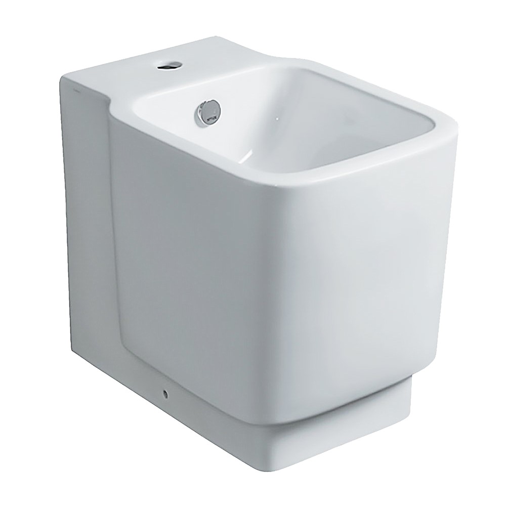 Glossy white ceramic bidet, in the size 49.5x35.5xH42 cm. A flexible and architectural concept for a new taste in toilet decoration. A minimalist and dyamic collection based on classic design elements, with geometric shapes that divide the common space. Flow offers a variety of combinations with a full line of accessories. Ideal for any small or large environment.