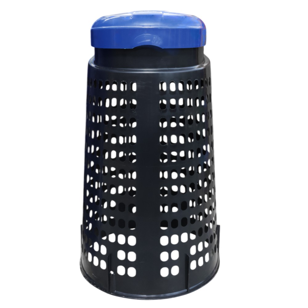 Grilled Eco-bin in polypropylene black with blue lid 110 liters. Robust, easy to use and also suitable for bags up to 110 liters. No assembly required. The product comes ready to use. It does not absorb odors, does not fear the moisture and is washable.