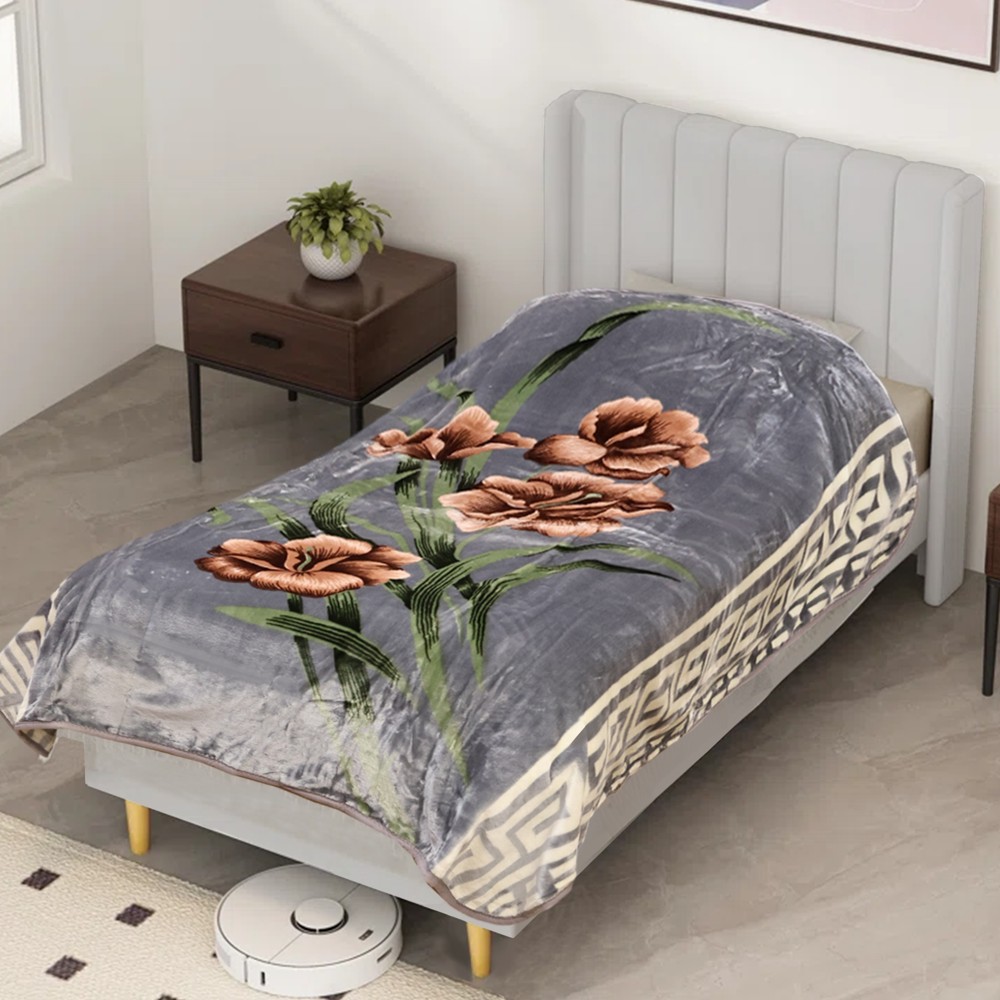 Blanket, Raschel, single, polyester, grey with flowers, 160x220 cm