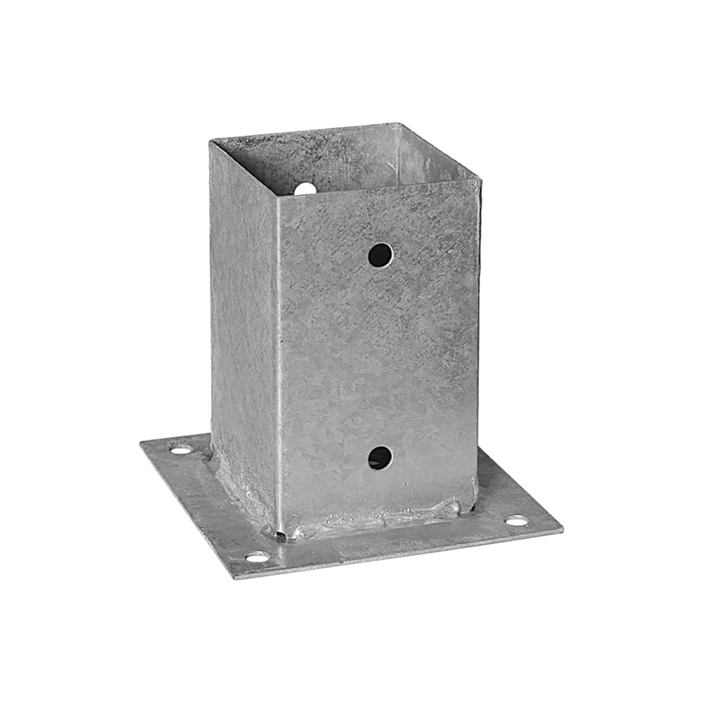 Bolt-down postfoot, made of structural steel material, with coating layer with galvanized zinc powder, in rectangular shape, with dimensions of 7.1x15x0.18 cm, in gray color. It is used to facilitate the assembly of wooden elements with concrete surfaces, while ensuring a proper expansion of the wood from the ground. The constituent material is resistant to use, heavy weights, rust or abrasion. It can be easily installed using screws.