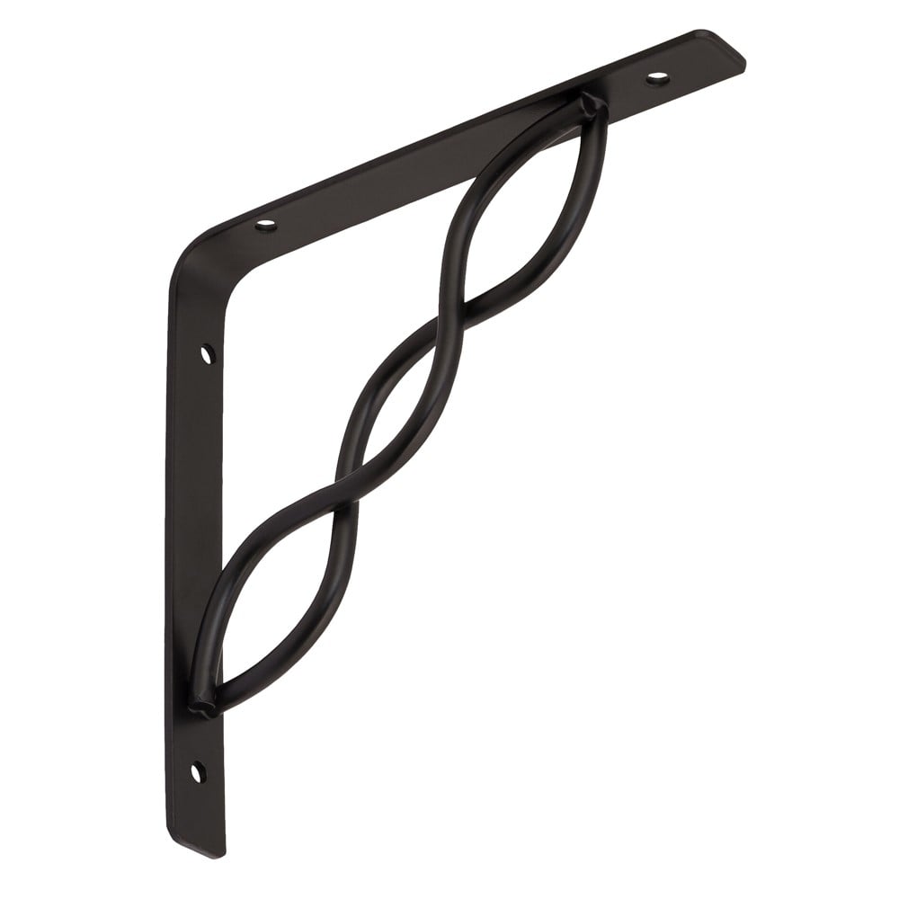 Shelf bracket with interlaced rod, made of sturdy steel material, in black color, with dimensions of 15x15 cm, which serves as a decorative and functional accessory for various environments. The constituent material is resistant to use, heavy weights, rust or abrasion. It is used for wall mounting of self-supporting shelves, but it can also find other applications in professional and non-professional environments.