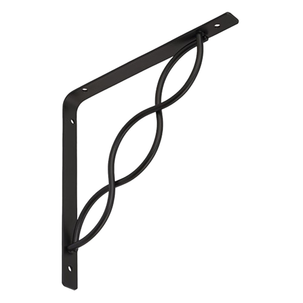 Shelf bracket with interlaced rod, made of sturdy steel material, in black color, with dimensions of 20x20 cm, which serves as a decorative and functional accessory for various environments. The constituent material is resistant to use, heavy weights, rust or abrasion. It is used for wall mounting of self-supporting shelves, but it can also find other applications in professional and non-professional environments.