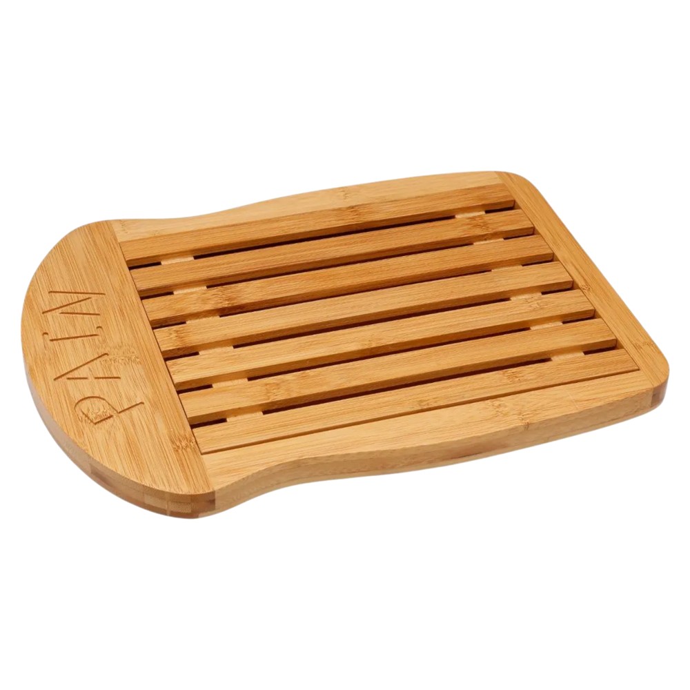 Beige bamboo wood cutting board. It has an open base so that the crumbs fall and do not dirty the kitchen counter. The ideal tool to cut food without leaving scratches in your kitchen. Unlike traditional wood, bamboo is more resistant to knife marks and water. To preserve the quality of your board, it is good to paint it with a little vegetable oil. Dimensions 34 x 26 x H. 2 cm