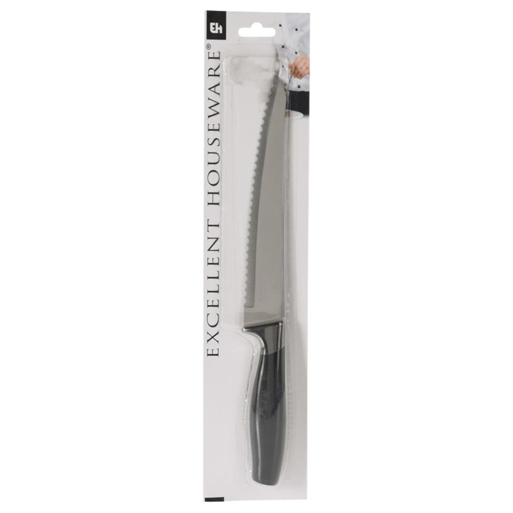 The 33 cm stainless steel bread knife with a black handle is a specialized tool for cutting bread and other bakery products with ease and precision. The stainless steel material guarantees durability and resistance to wear, while the ergonomic black handle offers a secure grip and comfort during use. This knife is an indispensable tool for any kitchen that requires professional results in cutting bread.