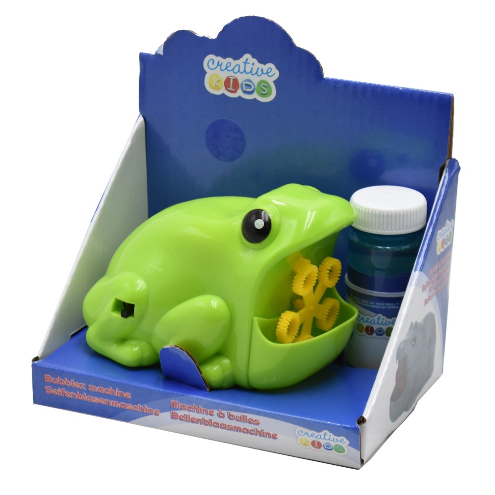 Toy frog for kids, made of plastic material, in green color. The frog can be filled with liquid soap and release bubbles as it walks. It helps to develop motor and perceptual skills in children and can also be used while bathing. This product is suitable for use in children over 18 months of age.