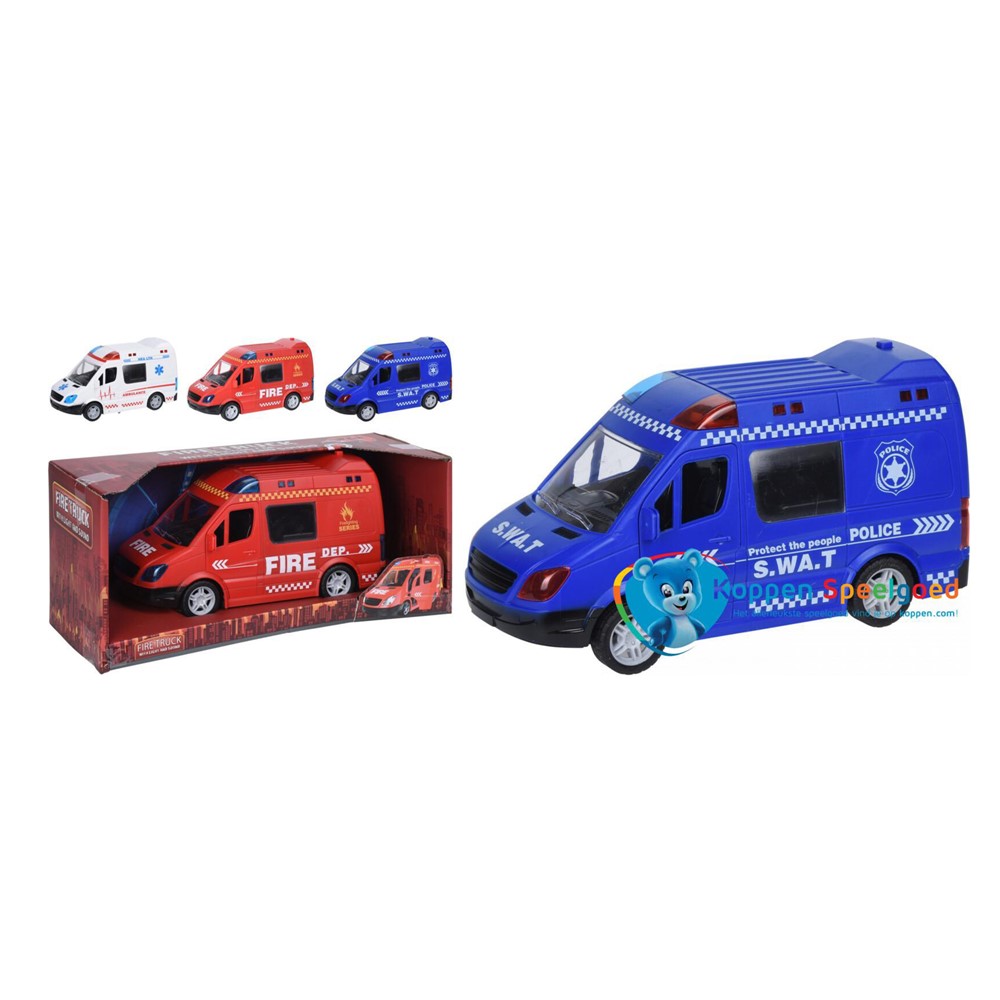 Car from emergency services, fire brigade, police or ambulance. The car consists of sirens and lights, the button on the roof is pressed to turn on the light and sound: the siren will go off and the flashlight will go off on the roof! The batteries are inside the car.