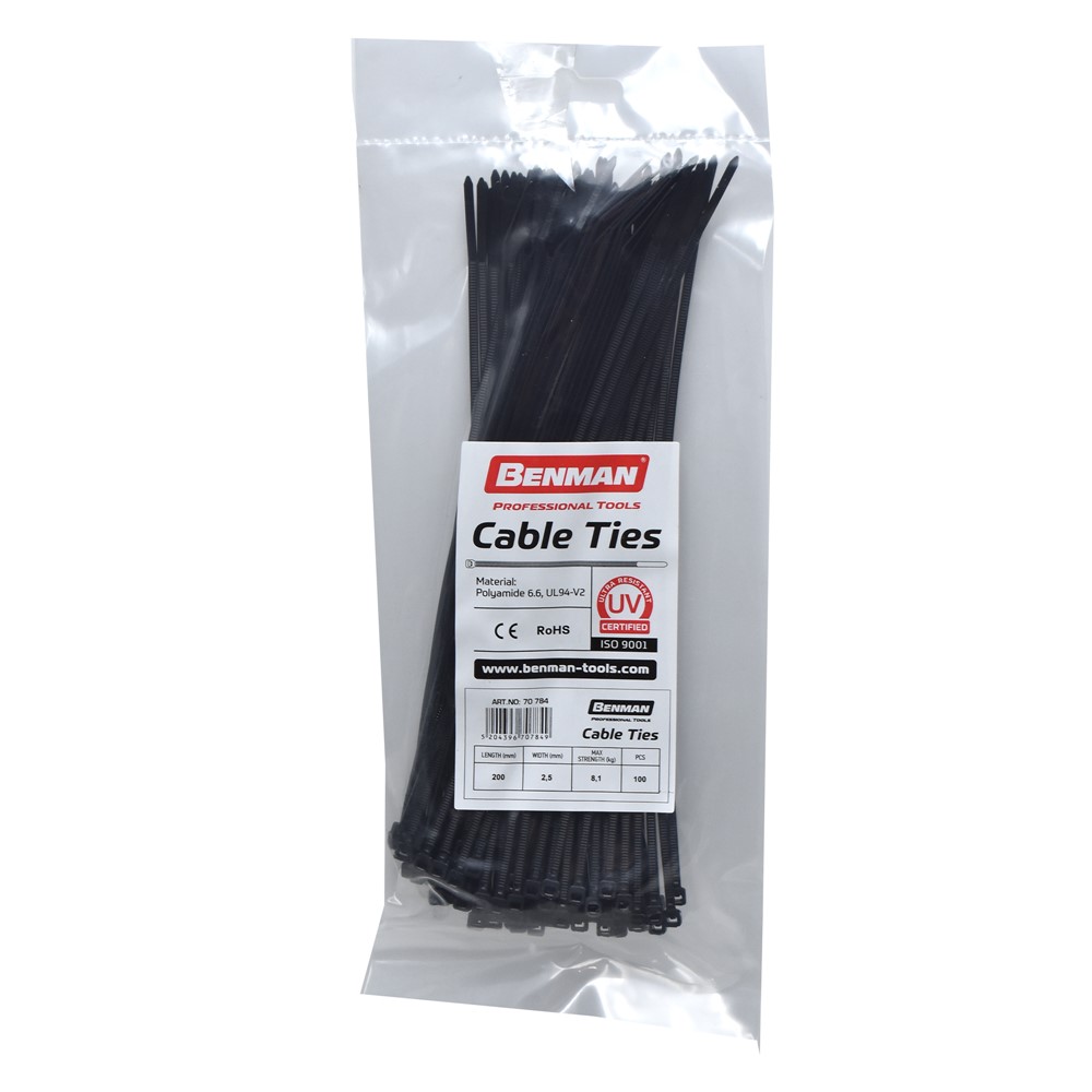 CABLE TIES, BLACK, BENMAN, 200mmX2,5mm (100pcs)