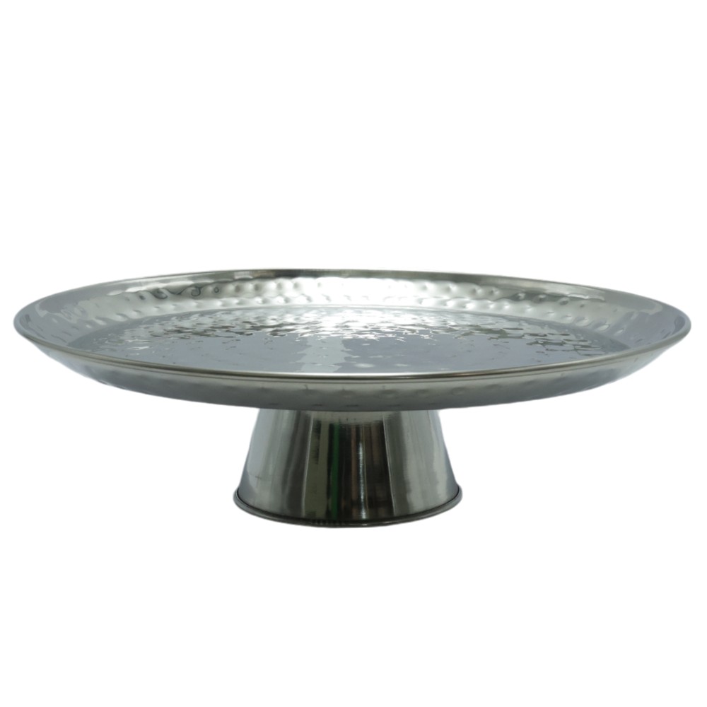 Silver stainless steel cake/cake stand with a unique design. Ideal for placing your cake or sweets on any festive or everyday occasion. The dimensions 26 x H. 8 cm make the latter accessible and very easy to store.
