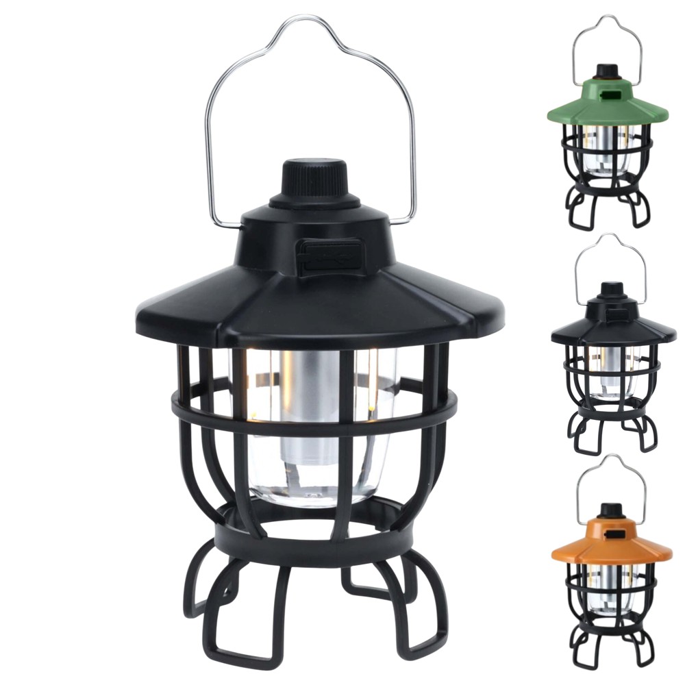 Rechargeable camping light, dimensions 13x18 cm, plastic material and black color. Practical and easy to transport, suitable for outdoor environments such as camping, traveling or emergencies.