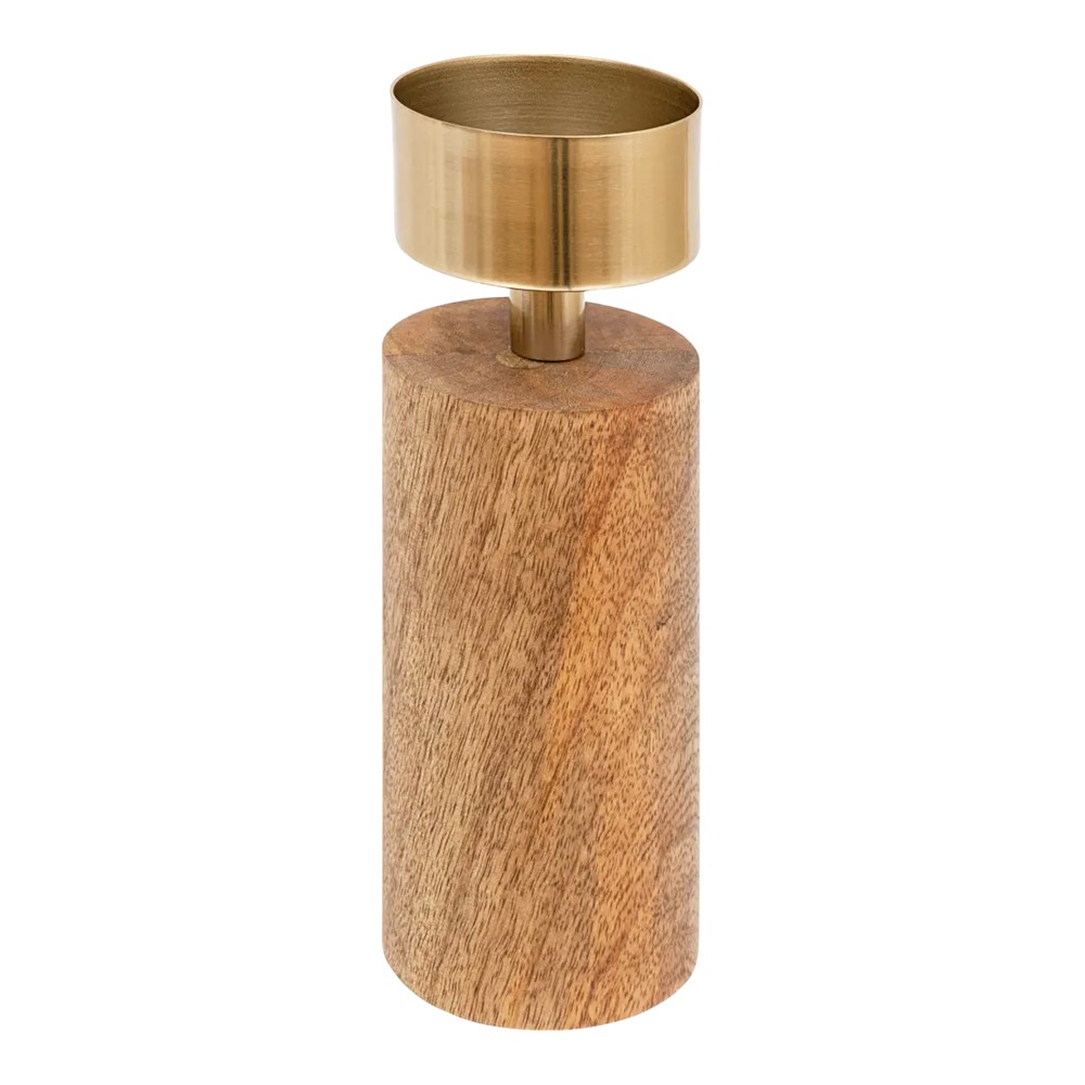Candlestick in a modern style. It is made of mango wood in beige-brown color with gold metal details. The candle holder is the medium size. Perfect to place on your coffee table or dining table.