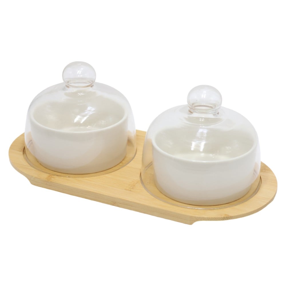 Set of two bombs or biscuits for biscuits, made of glass and bamboo, in transparent and brown colors. The set is stylish, offering an attractive presentation for sweets or biscuits.