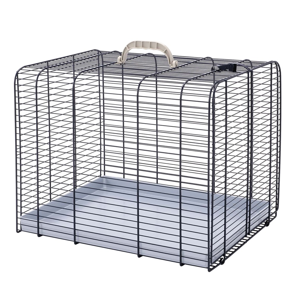 To take your feline with you, on a short or long journey or for feline exhibitions, the Cat Transport is perfect. This pet carrier consists of a blue painted metal mesh and a comfortable removable sturdy plastic bottom, for easy cleaning. The front opening with safety hook allows you to manage your cat in total peace of mind. Easily transportable thanks to the handle on the top. Available in two sizes depending on the size of your kitty.