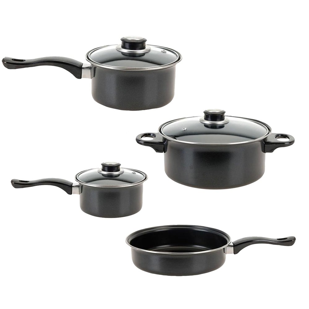 The cookware set is made of carbon steel with a non-stick coating. With this non-stick set, you can prepare various dishes for your family. Since the cookware set is compact, it is also convenient to take with you. These cookware are only suitable for gas stoves. The set includes 3 pots with a capacity of 1.4 L and 1.5 L along with their lids and a frying pan with a capacity of 2.5 L.