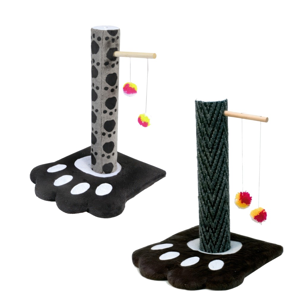 Carpet scratching post with plush base shaped as a paw that allows every cat to stretch and scratch as much as they want, with funny pom-poms for an extra touch of fun.