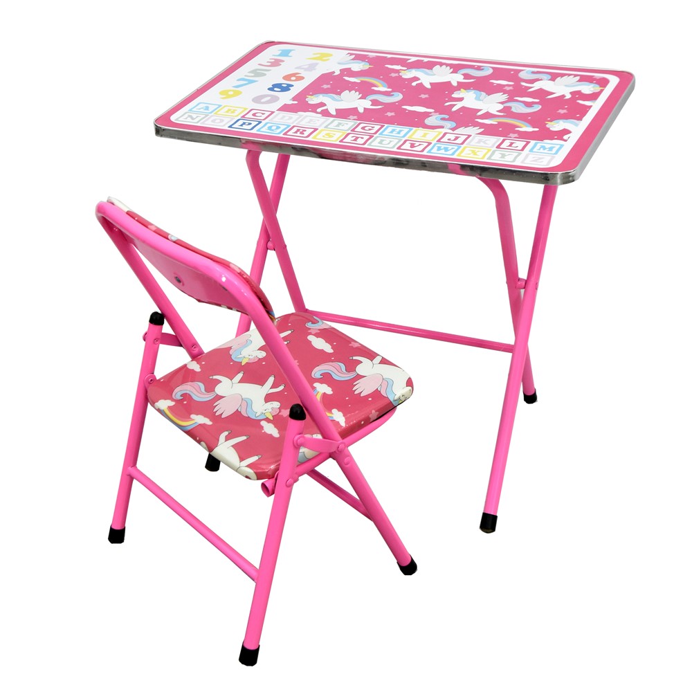 Chair and table set for kids, which includes a table with dimensions of 63x40x51.5 cm and a chair with dimensions of 27.5x27.5x26 cm, with a structure made of durable iron material, with seats and supports made of PVC material, in pink color, with Unicorn design. The desk is equipped with prints of letters of the alphabet and numbers on the surface, which serve to help young children develop their memory and their numerical and analytical skills. This product is suitable for use by children over 4 years old.