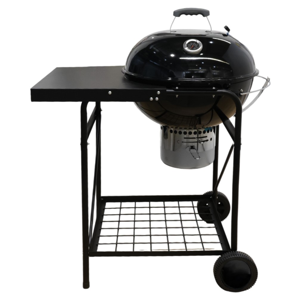 Experience the authentic aroma and taste of barbecue with this charcoal barbecue designed to offer high performance and maximum comfort. Built with quality material and practical design, this barbecue will become your ideal companion for cooking in the yard, veranda or garden. Made of glossy black enamel material, guaranteeing resistance to high temperatures and easy cleaning after each use. With a grill diameter of 54 cm, there is enough space to prepare meals for your family and friends at the same time, allowing you to cook meat, vegetables and fish without restrictions. Equipped with a side table for preparing and storing food or barbecue tools, offering you maximum comfort during cooking. It also has a thermometer integrated in the lid for optimal temperature control and a steel handle with nylon coating for safety and ease of use. Thanks to the aluminum ash catcher and two plastic wheels, cleaning and moving the barbecue is effortless.