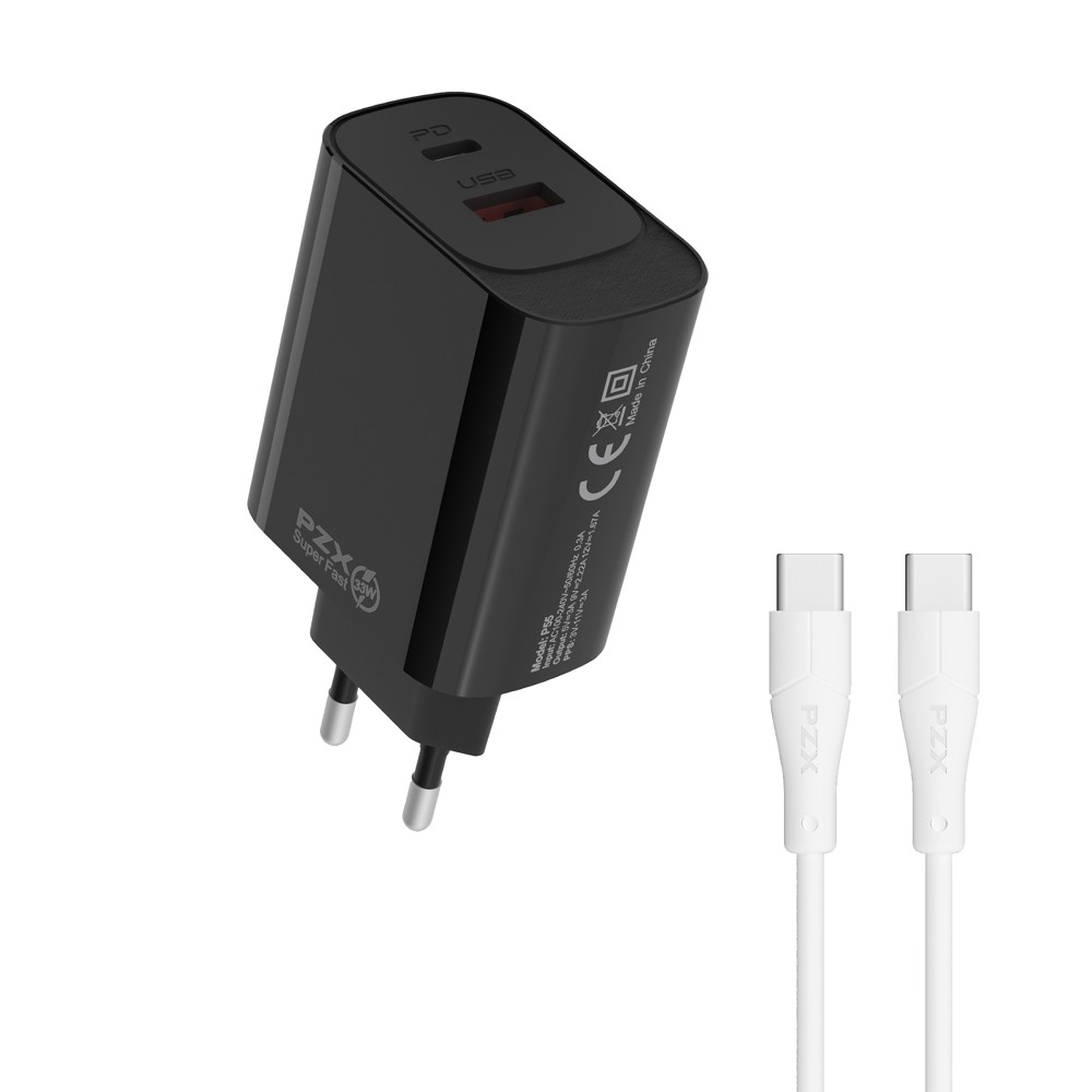 The PZX set includes a 33W charger head and a 1-meter cable, providing a complete solution for charging your devices. With two USB and Type-C ports, this charger can simultaneously charge phones, tablets and other devices quickly and efficiently. The 1-meter cable guarantees freedom of movement during charging, while the elegant white design fits into any environment. Ideal for use at home, in the office or on the go.