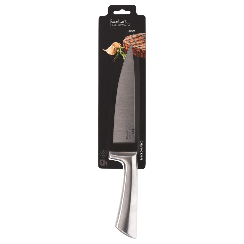 The 33 cm long, silver-colored stainless steel chef's knife is a professional and multifunctional tool for any kitchen. With its high sharpness, this knife makes it easy to cut and chop various ingredients such as meat, vegetables and fruits. The stainless steel material ensures resistance to rust and wear, while the classic and elegant silver-colored design gives it a professional and durable look. This knife is an indispensable tool for any chef who requires precision and efficiency in food preparation.