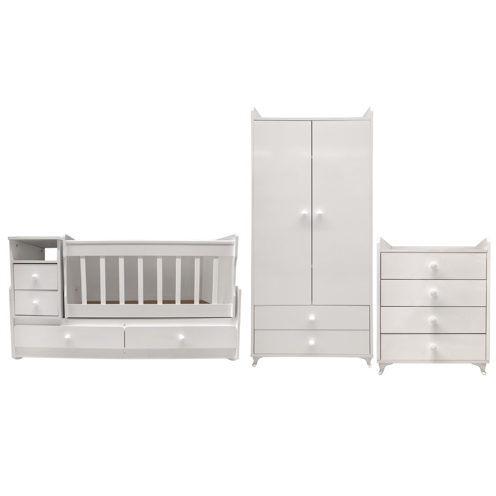 Children's bedroom set made of melamine material, in natural color. This set includes a baby rocking bed measuring 100x165x65 cm. A wardrobe with drawers measuring 190x120x45 cm, as well as a chest of drawers and changing table measuring 85x64x45 cm.