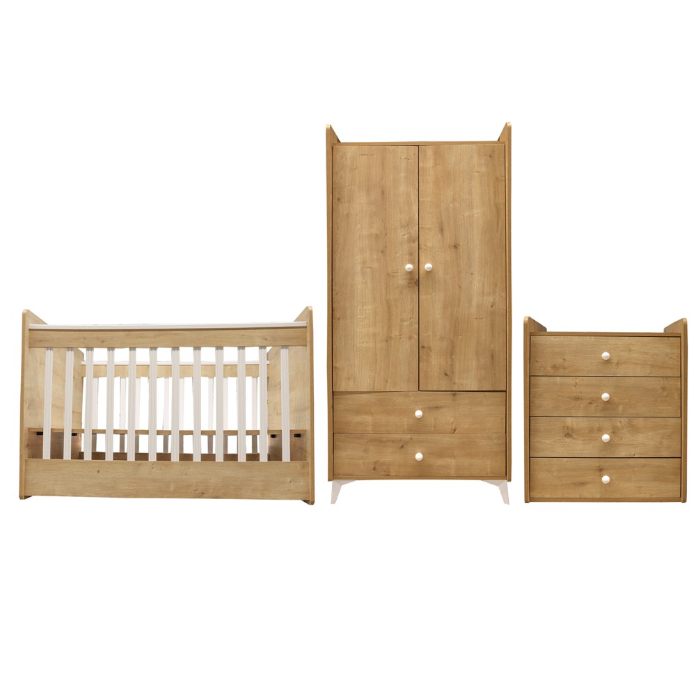 Children's bedroom set made of melamine material, in natural color. This set includes a cot measuring 95x132x68 cm. A wardrobe with drawers measuring 192x90x45 cm, as well as a chest of drawers measuring 82x80x45 cm.