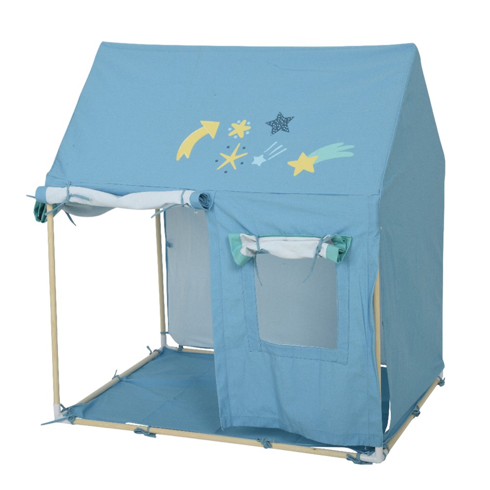 The children's tent, made of durable polyester material, provides a safe and fun environment for children. With dimensions L110-W80-H120 cm, the tent is suitable for creating a small space for children's games. Designed in blue, this tent is easy to assemble and is ideal for use indoors.
