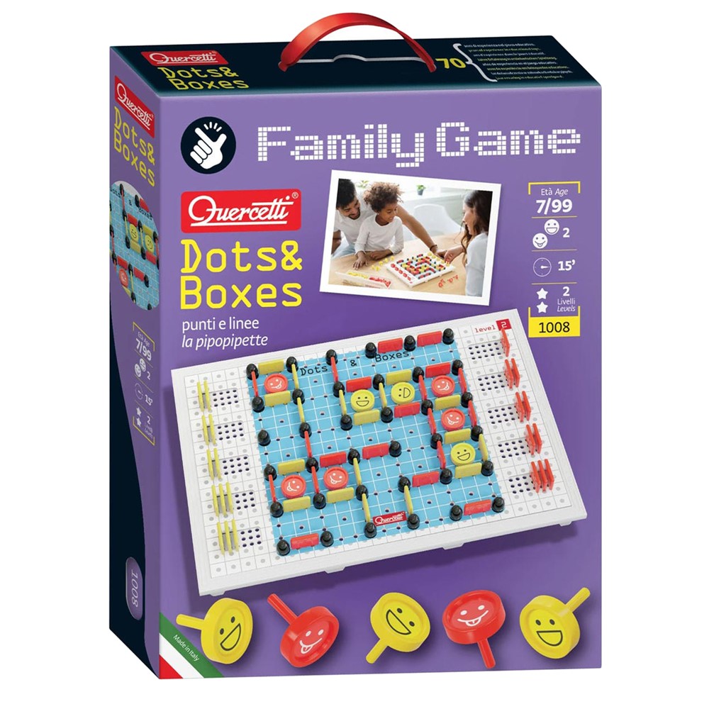 Dots & Boxes is an exciting strategy game from Quercetti that is used by two players. Each player places a stroke, horizontally or vertically, between two adjacent points. If this shot forms a square (a 1x1 square), place your token on the square formed. In addition to a point, you also gain an extra turn! Whoever builds the most squares wins! The playing time is approximately 15 minutes. Suitable for children from 7 years.