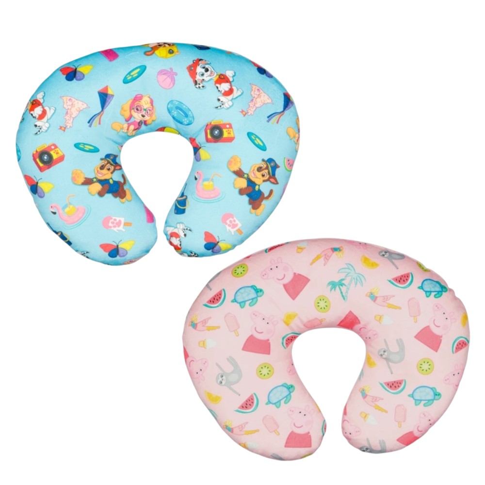 Travel pillow with Peppa Pig or Paw Patrol design, U-shaped, made of polyester material, and filled with soft polyurethane material, with antibacterial and hypoallergenic properties. It is used to support the head or to sleep during a car or plane trip, without damaging the cervical vertebrae. It has compact dimensions, which make it practical to take with you on trips. The constituent material is soft on the skin and does not cause irritation.