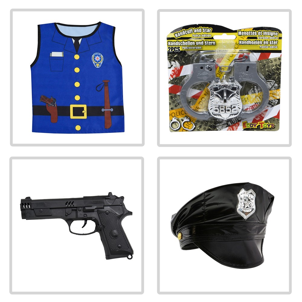 Children's Halloween set, which includes a policeman costume for children, a policeman's hat with a hood, a plastic toy gun and plastic handcuffs with a policeman's emblem.