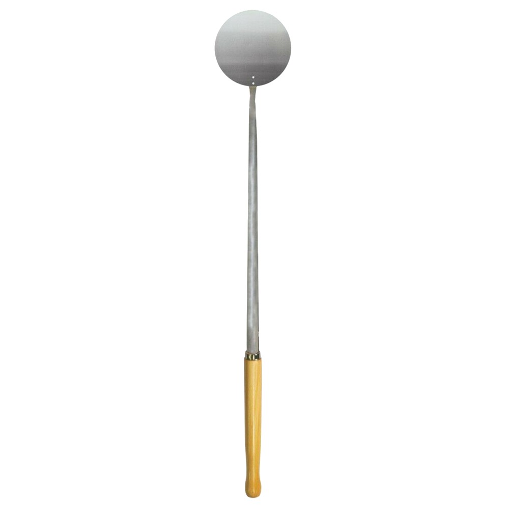 Circular pizza shovel. Its circular shape and small dimensions with a diameter of 18 cm make it ideal for placing small pizzas inside and outside the oven. Made of aluminum, a light and resistant material, the shovel is equipped with a comfortable 77 cm long beech wood handle to ensure a firm and comfortable grip.