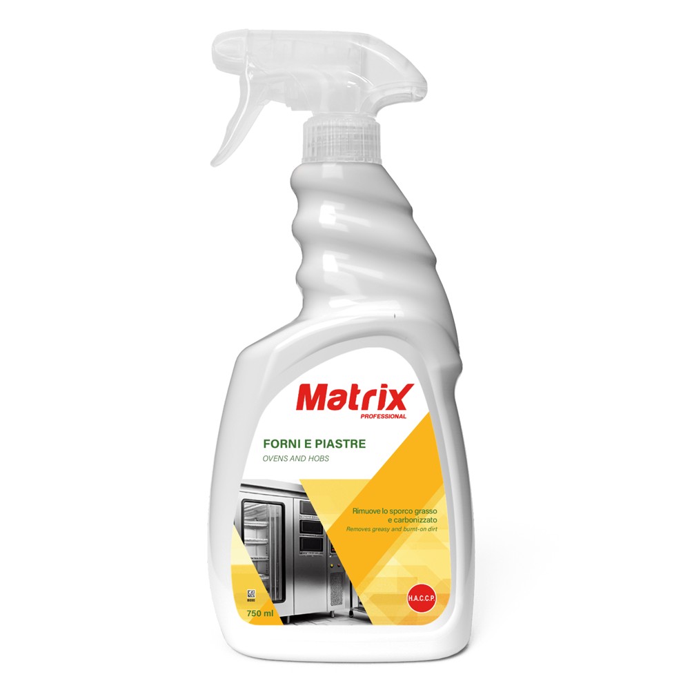 Oven cleaning detergent, Matrix. Alkaline detergent, effectively removes greasy and carbonized cooking residues. Effective even when cold. Spray the detergent on the surfaces to be cleaned, leave it to act for a few minutes then remove with a cloth or sponge and rinse thoroughly with water. For optimal results, use on surfaces that are still hot (50 °C - 60 °C).
